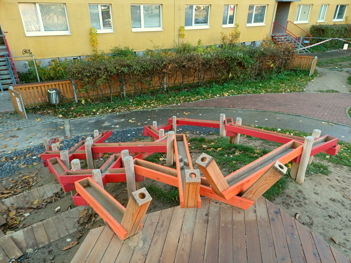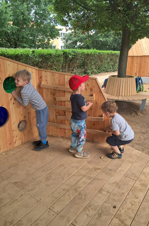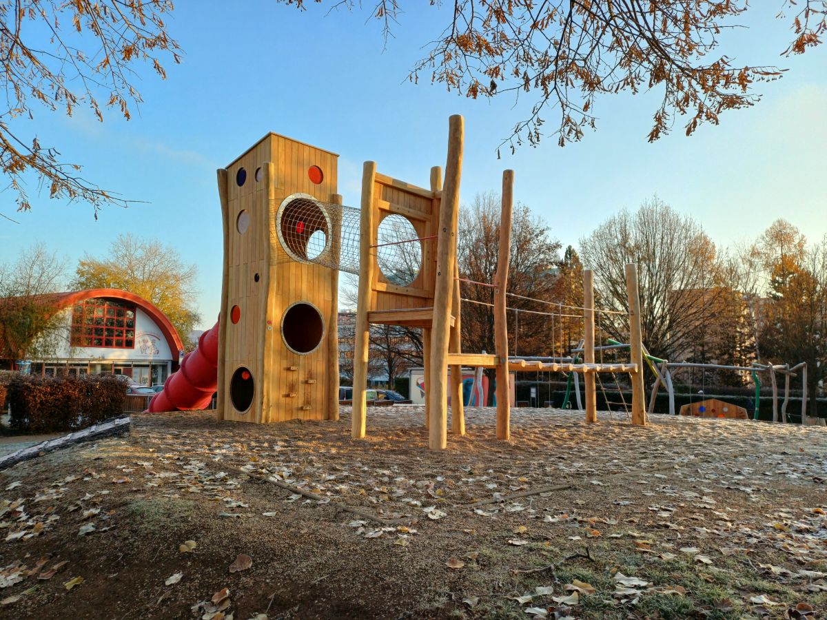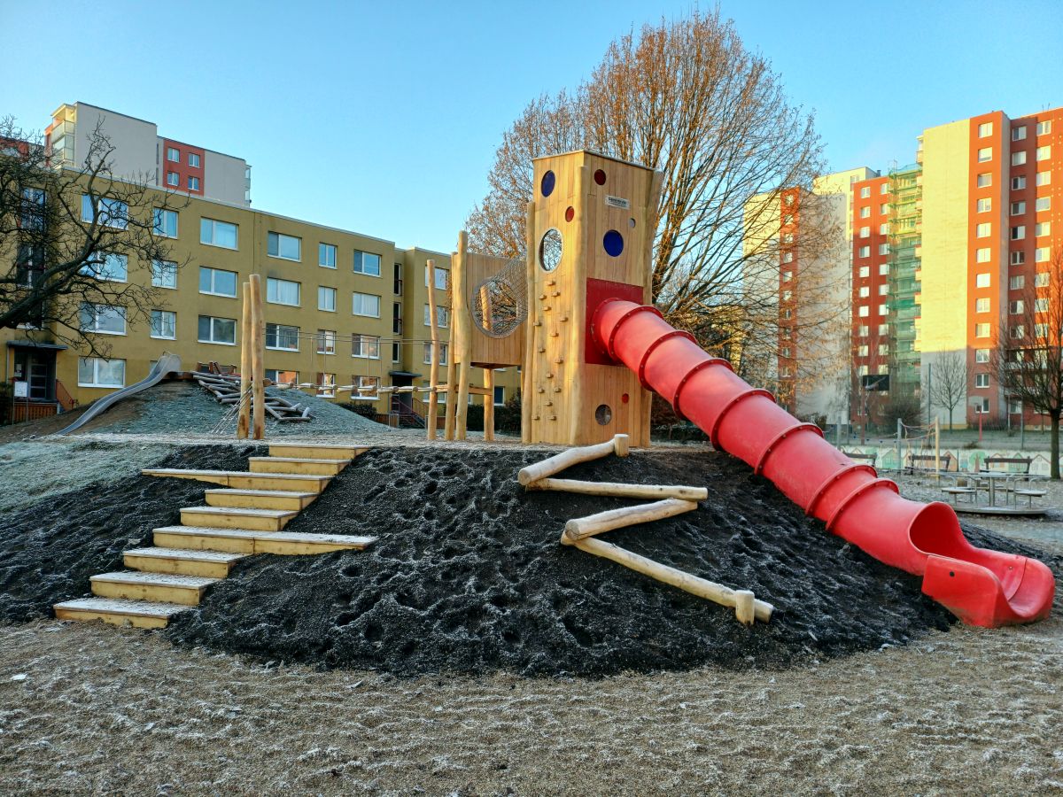 Dynamiku mořských vln věrně simuluje sestava zemních trampolín, habrové bludiště a kolotoč. Na Pláži se mohou nejmenší děti protáhnout v akční pohybové zóně nebo se zcela ponořit do hry s pískem a zkoumání fyzikálních zákonitostí. Sopka je ideálním terénem pro skluzavku a kuličkovou dráhu s mechanickými a zvukovými doplňky, v zimě také k sáňkování. Divoký Prales nabízí starším dětem a teenagerům výzvy ve výškách, dále obří kolotoč a vertikální prolézačku, která tvoří komunikační prostor k sousedícímu sportovnímu hřišti. Prostor na dovádění ve spleti mostků, v tunelu, jeskyni a na tobogánu děti snadno najdou na Ostrově Dobrodružství v multifunkčním horském masivu.