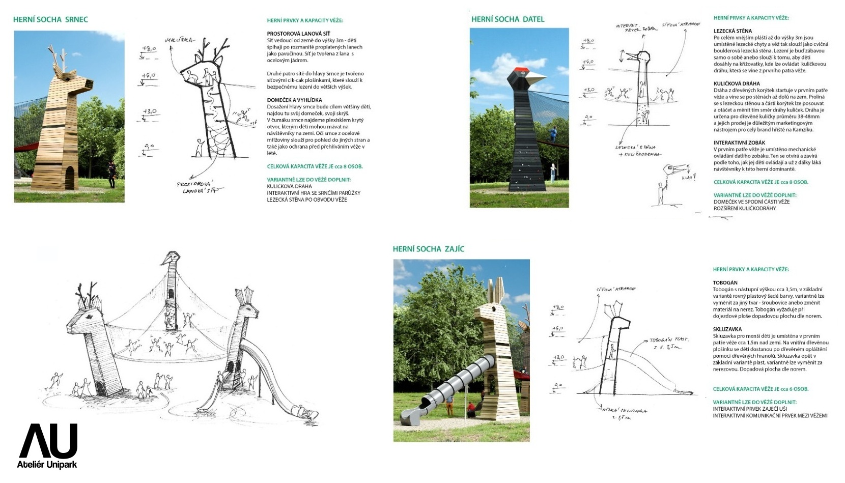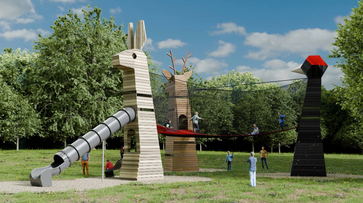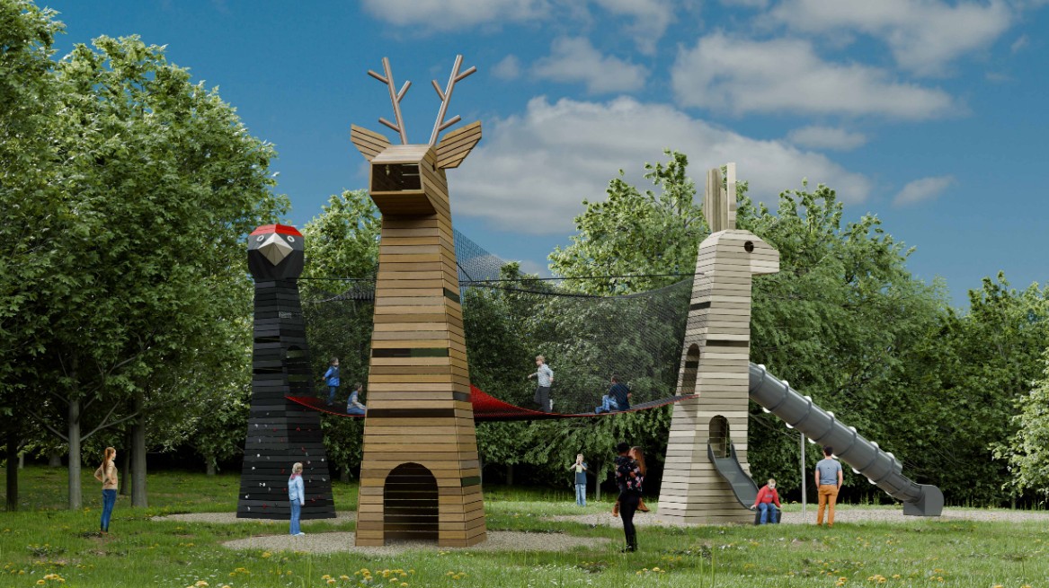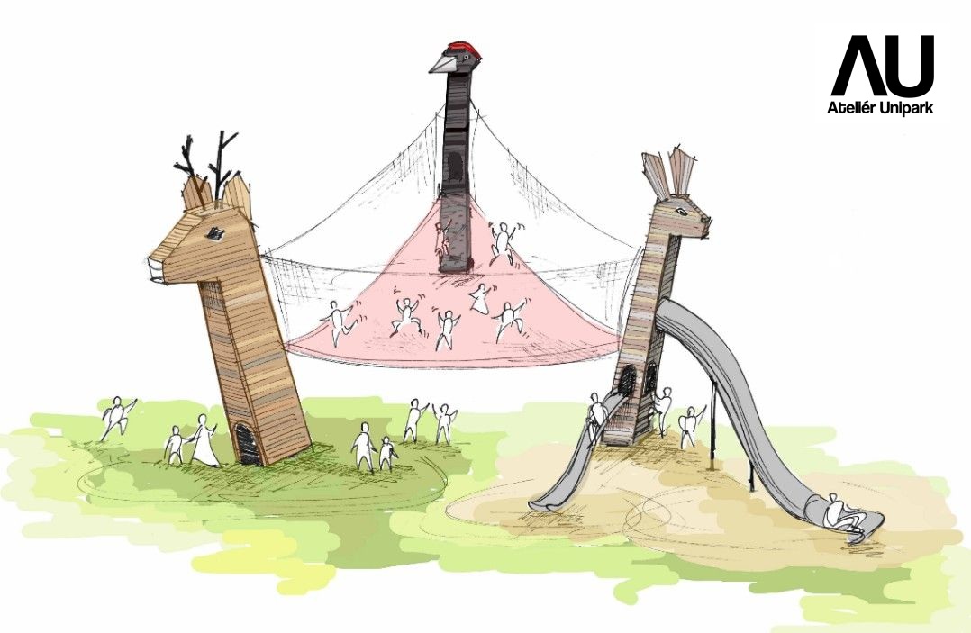 Dětské hřiště Tři krky tvoří vizuálně velmi atraktivní prostor. Velkoplošná síťová atrakce je zde napnutá mezi originální věže představující tři různá zvířata. Nabízí skutečně pestré pohybové vyžití, mnoho herních příležitostí a interaktivních prvků. Datel obsahuje lezeckou stěnu, kuličkodráhu i mechanismus pro pohyb datlího zobáku včetně věrné audionahrávky. Hlava Srnce s lezeckými chyty a prostorovou lanovou sítí uvnitř je úkrytem i rozhlednou. Hravý Zajíc snadno zláká tobogánem / skluzavkou i možností ‚stříhat ušima‘. Kombinace dobrodružného lezení, skákání, objevování a pestrého designu hřiště Tři krky zaručí, že každá návštěva bude pro děti velmi oblíbenou, vzrušující výpravou.
