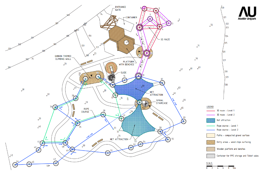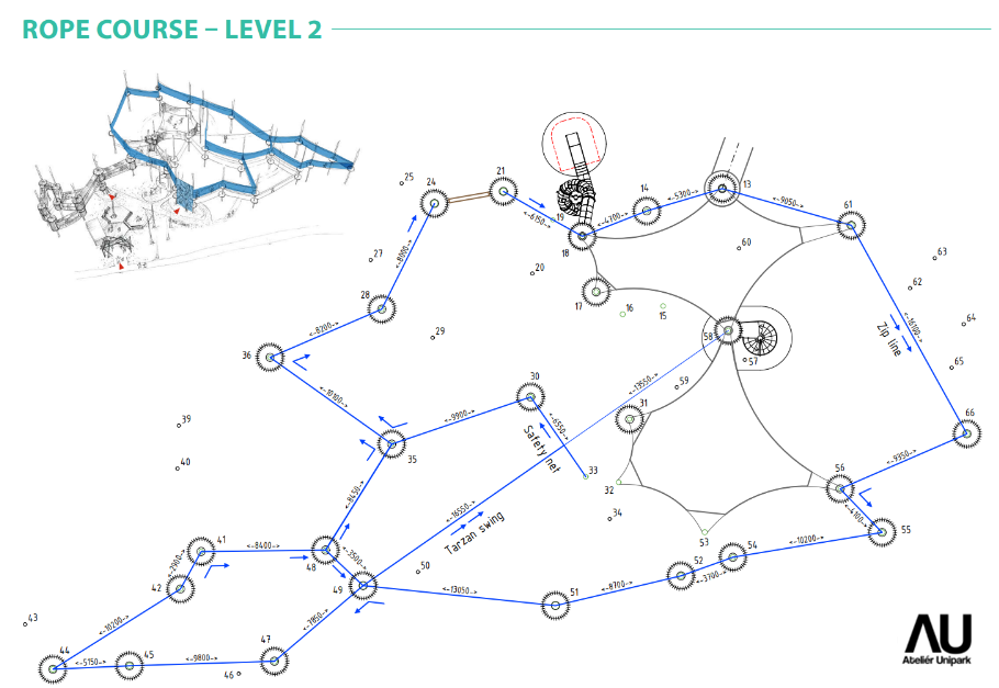 Návrh Jinan forest adventure parku byl vytvořen na míru specifické lokalitě a investičnímu záměru čínského klienta. Ucelená koncepce se promítá do architektonického i výtvarného řešení všech funkčních prvků areálu. Adventure park představuje soubor vzájemně provázaných adrenalinových atrakcí – lanový park se dvěmi úrovněmi obtížnosti, 3D bludiště a 2 síťové atrakce s tobogánem. Součástí návrhu je také vstupní brána, zázemí s mobiliářem a síť cest v okolí atrakcí, nabízející pestré možnosti aktivního vyžití pro různé věkové skupiny.