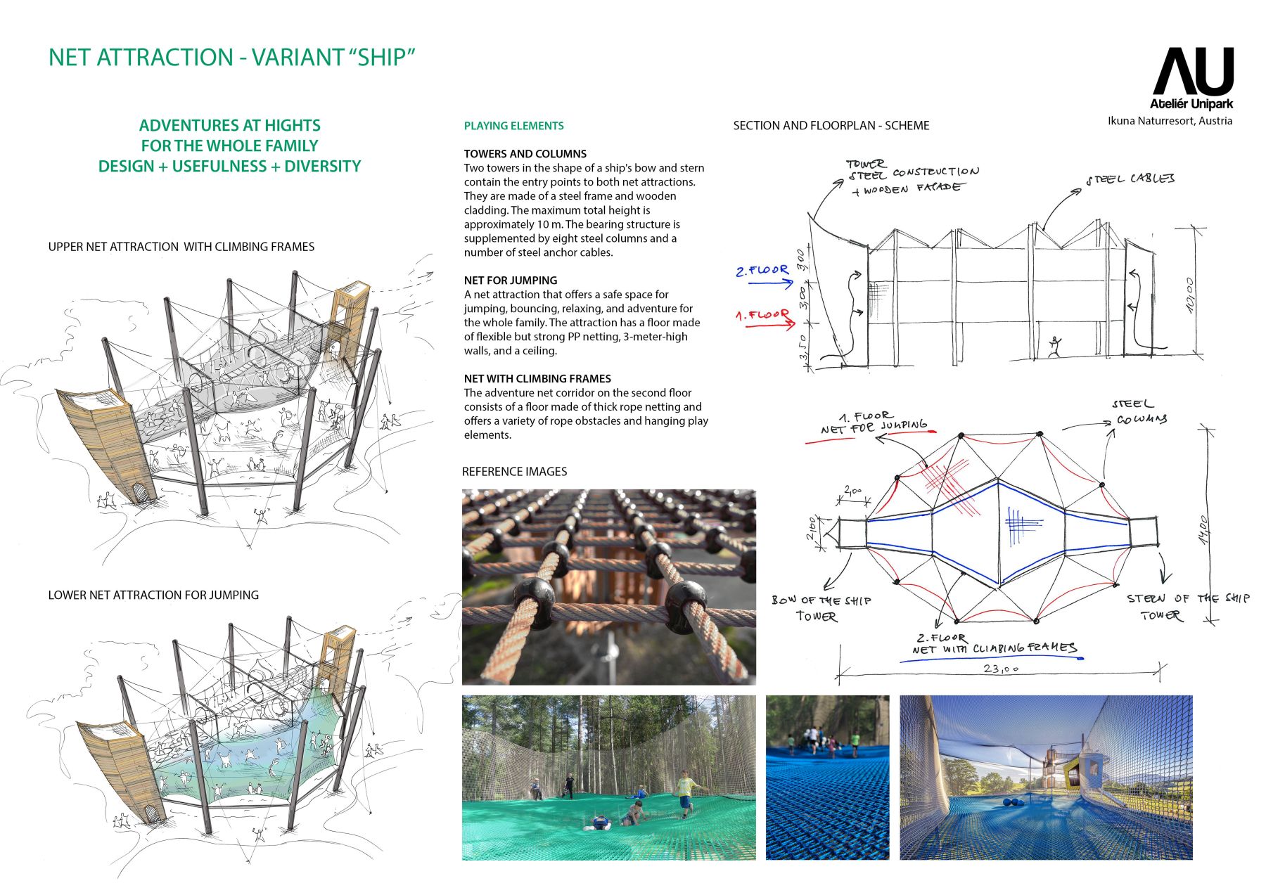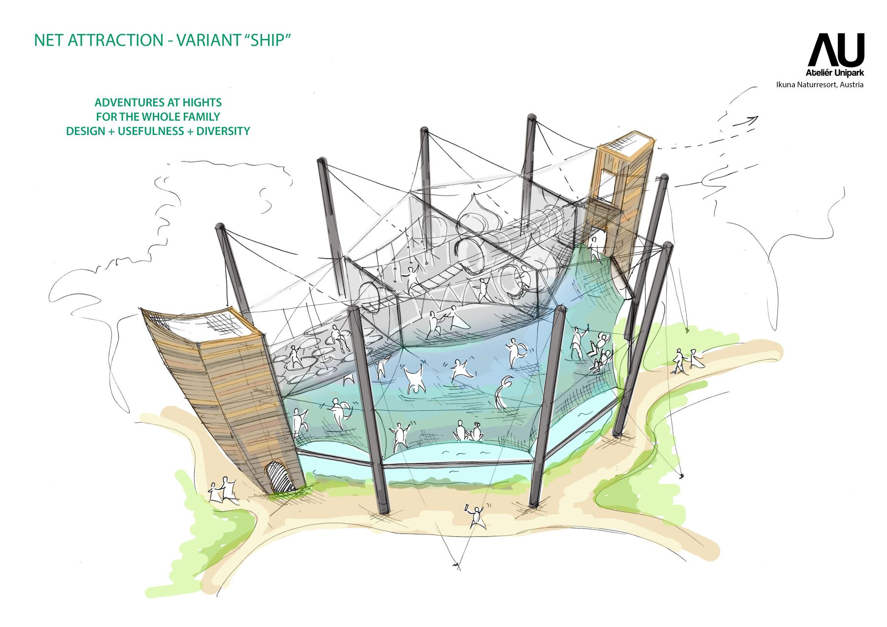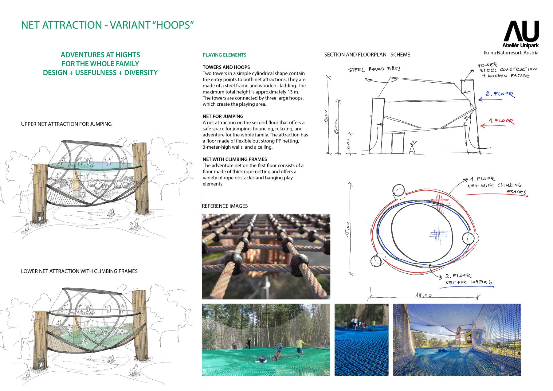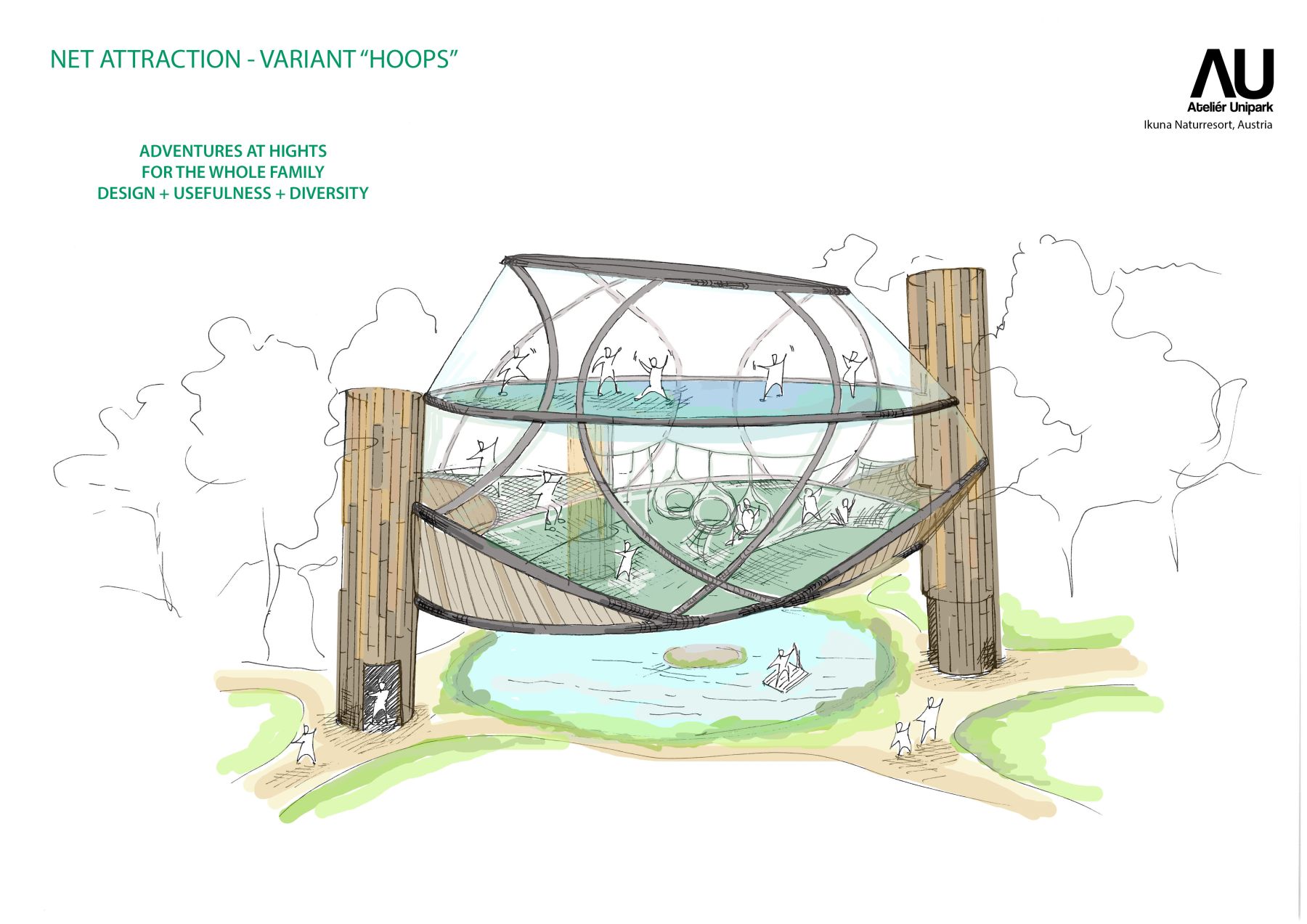 Návrh originální síťové atrakce pro rakouský Ikuna resort je jedinečný nejen lokalitou, ale i svým umístěním nad vodní plochou. Cílem návrhu bylo vytvořit jedinečný zážitek, který zvýší atraktivitu resortu a rozšíří nabídku aktivit pro všechny generace návštěvníků. Síťová atrakce nabízí bezpečné prostředí pro hru, pohyb, akrobacii i relaxaci a je určena jak dětem, tak dospělým. Díky své koncepci podporuje společný zážitek celé rodiny a přirozeně propojuje aktivní odpočinek s pobytem v krajině.