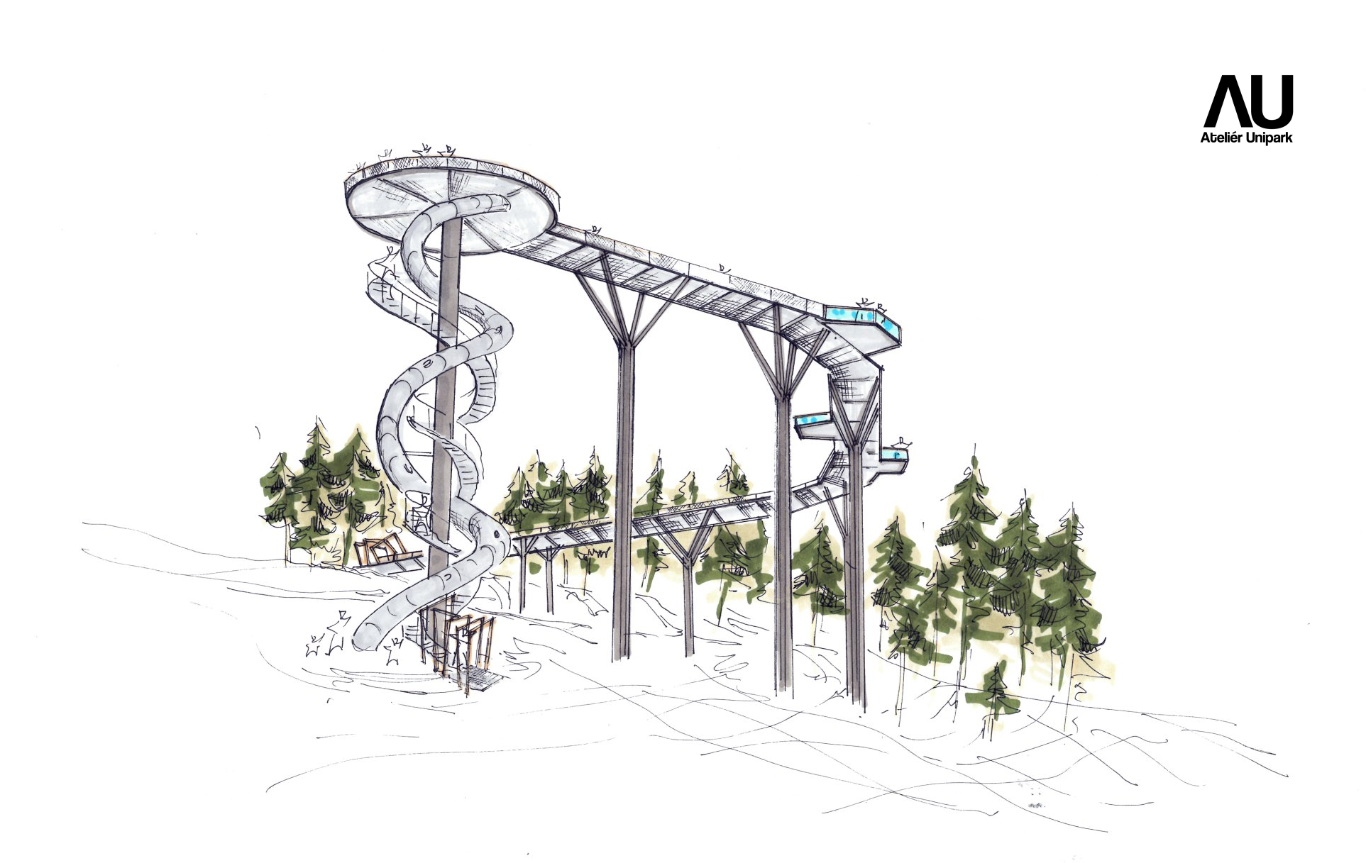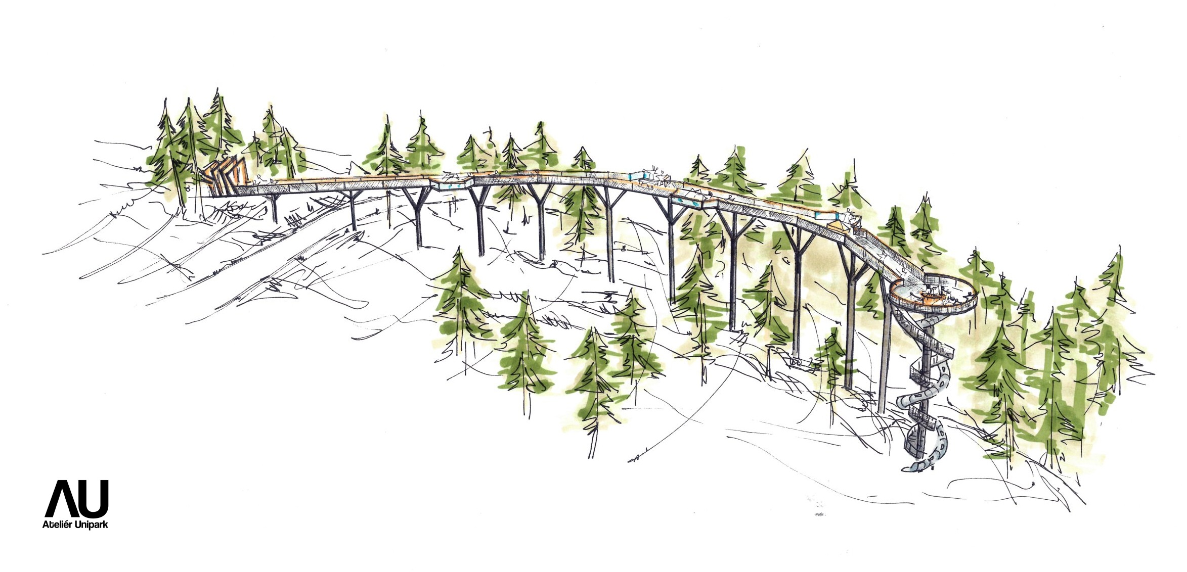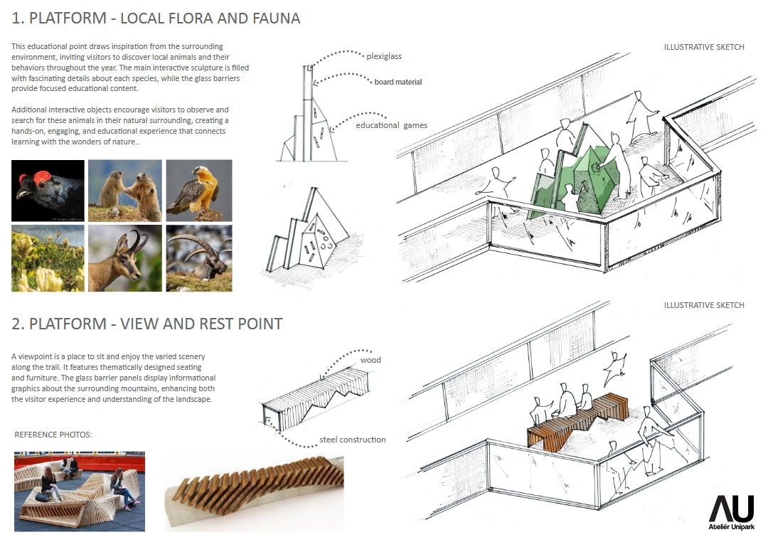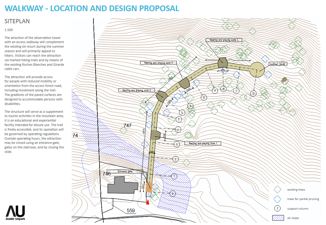 Studie Vyhlídkové stezky ve Francii představuje originální atrakci, která návštěvníkům nabízí intenzivní zážitek a dechberoucí výhledy na horskou krajinu Val Cenis. Koncept pracuje s postupným gradováním trasy – od vstupu v lese až po otevřený prostor nad korunami stromů ve výšce více než 20 m nad terénem. Bezbariérovou trasu o délce 126 m s odpočinkovými platformami zakončuje vyhlídková věž s 360° panoramatickým rozhledem. Pro milovníky dynamických zážitků nabízí stezka také adrenalinovou jízdu točitým tobogánem.